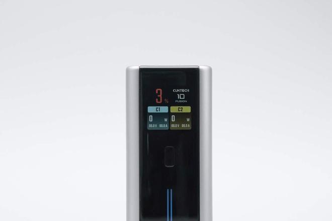 酷态科10号超级电能充Fusion二合一充电器延续银灰色金属质感壳体搭配黑色亚克力面板设计,同时还带TFT万象屏和脉冲星轨灯带,激活状态下可谓是科技感满满。