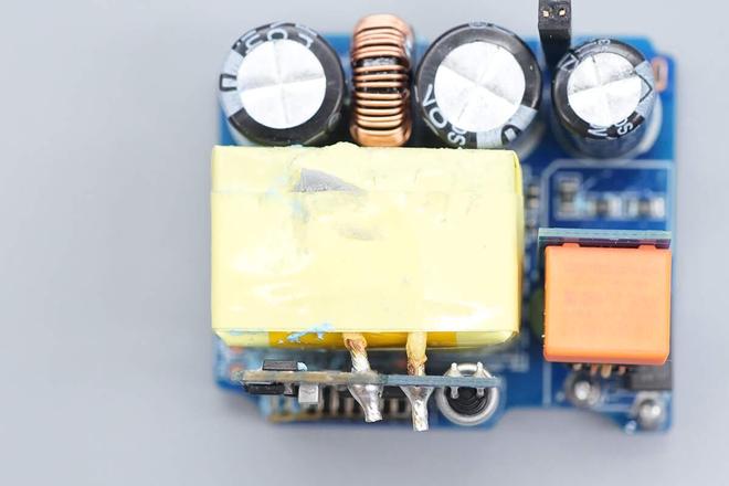 充电器电源模块也设计独立小板,夹层间焊接高压滤波电解电容、变压器等器件并填充导热胶,顶部独立小板还覆盖导热垫和散热板。