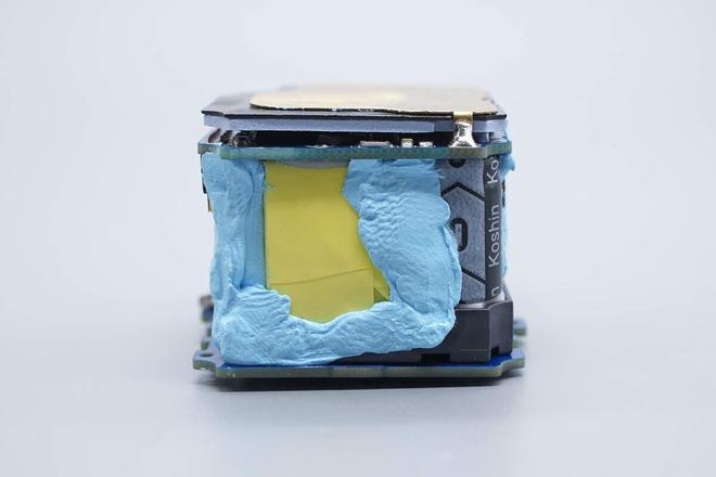 PCBA模块一览,其中USB-C2接口母座焊接在独立小板上,夹层间设有蓝色导热垫为同步升降压开关管等功率器件散热。