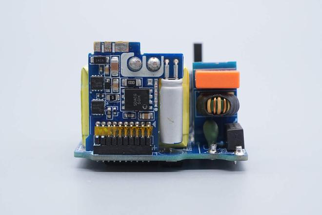 此外主板上还设有延时保险丝、NTC热敏电阻,输入小板上焊接安规X2电容和共模电感,第二块小板上设有同步整流管、输出滤波固态电容以及VBUS开关管。