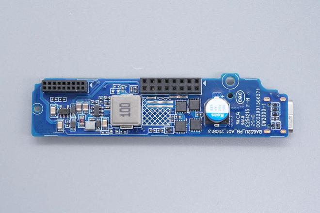USB-C2接口母座所在小板正面设有同步升降压转换器、升压芯片和VBUS开关管。