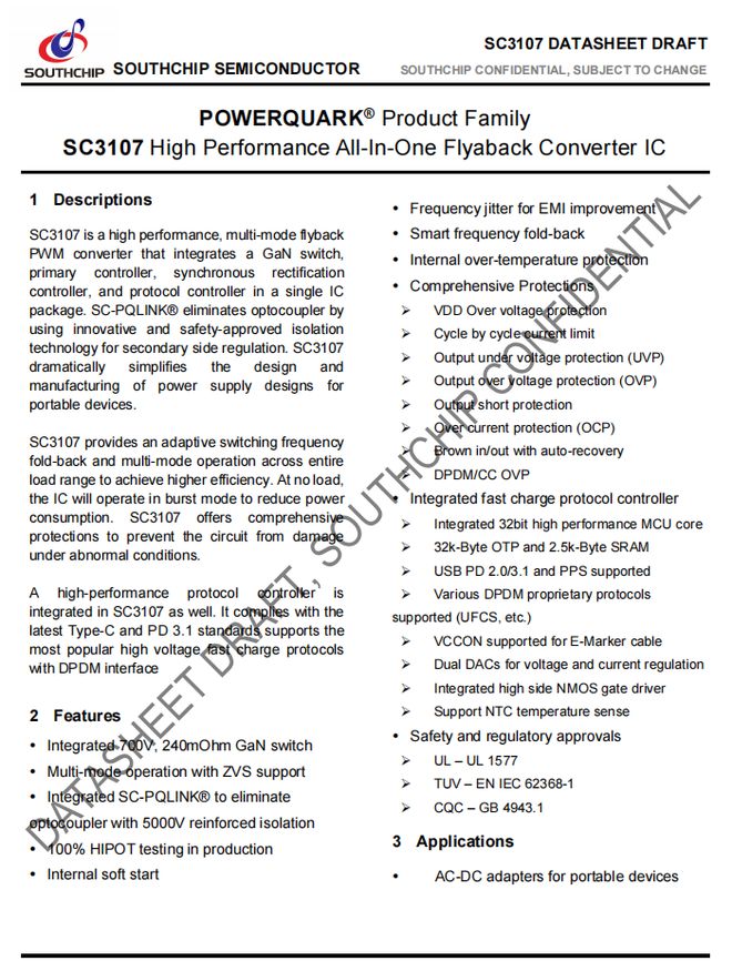 电源主控芯片SC3107C来自南芯科技的全集成芯片系列POWERQUARK®。该芯片采用南芯自研的全集成高压隔离封装,内置了原边控制器,氮化镓功率管,高速隔离数字通讯模块SC-PQLINK®,同步整流控制器和协议芯片。实现了用一颗芯片替代传统方案中的五颗芯片。
