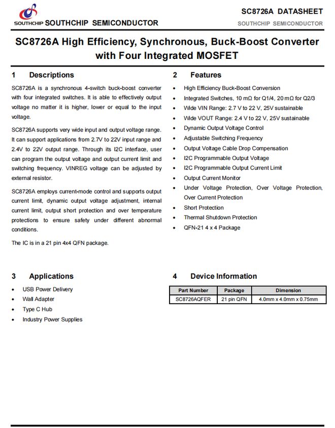 SC8726A支持2.7-22V超宽输入电压,以及2.4-22V超宽输出电压。集成了I2C功能,方便客户使用控制芯片,用户可通过I2C配置输出电压,输出电流限流及开关频率。SC8726A采用电流控制模式,支持输出电流限流,动态输出电压调整,内部电流限流,输出短路保护及过温保护,确保芯片能够工作在各种异常情况。SC8726A采用21pin 4x4 QFN封装。